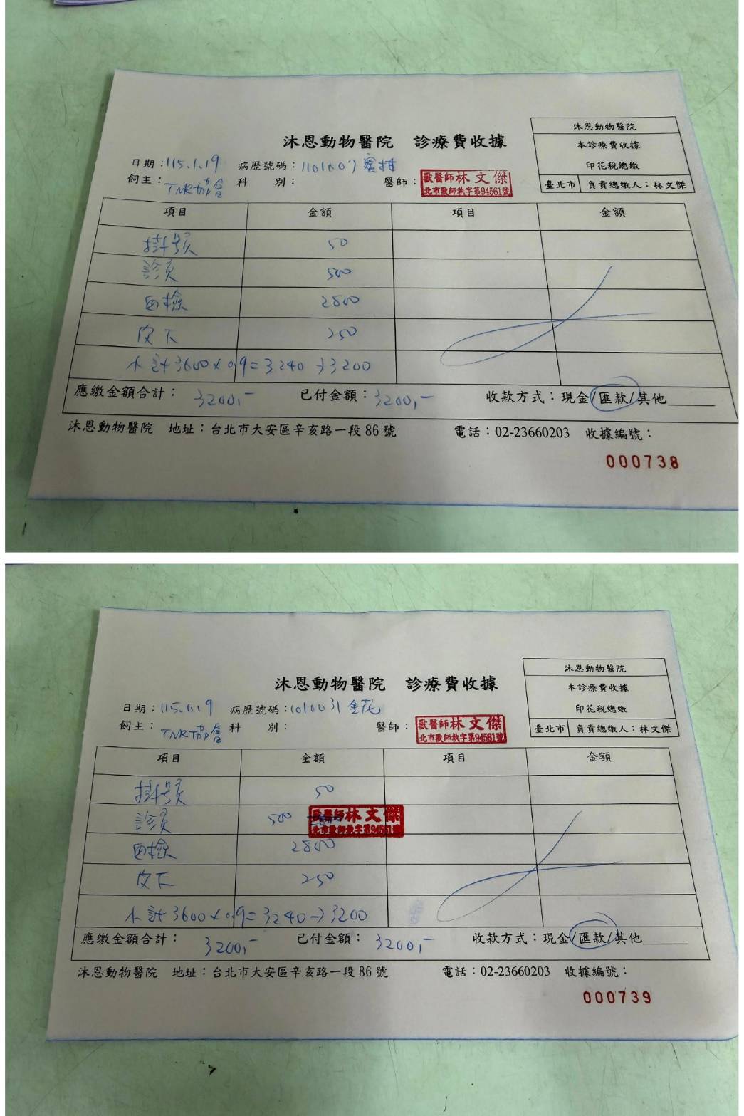 2026年1月因金花連續幾日食慾不振且頻繁嘔吐因此安排於沐恩醫院回診,體溫正常無發燒,沒有特別需要注意的超標指數。紅白血球、肝腎指數都正常,只有白蛋白比較低一些。且有些脫水,因此先每日餵食胃乳並施打林格輸液,目前已恢復良好。本筆醫助是金花於2026年1月19日間於沐恩醫院的費用,包含回診,血檢,及用藥。