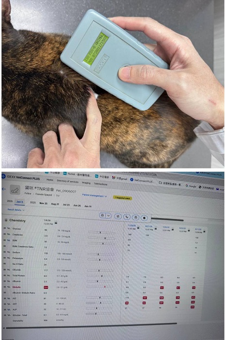 2025年6月11日,黛咪因每週日的固定測量體重逐漸減輕,又眼睛分泌物多、結膜紅及有濃鼻涕,還有右後腳底摸起來有點泡泡,約診木恩醫院檢查,觸診後腳略為泡泡的但沒有發現傷口,血檢結果,發炎指數及肝指數都升高,X光檢查並沒有發現異常,超音波檢查肝臟沒有發現腫瘤影像,但沒有看到膽的影像,而黛咪來到協會後並未做過膽摘除手術,這樣情況除了是膽有纖維化造成與旁邊組織的辨認度變差,或是膽囊曾破裂沒有脹大,因血檢顯示並不像肝臟有急性發炎,所以就先吃抗生素,除了對呼吸道有效果,若肝指數升高是細菌感染引起及腳底泡泡的是發炎都也會有效果,同時也有促進食慾功能,眼睛則點抗生素眼藥水及人工淚液。