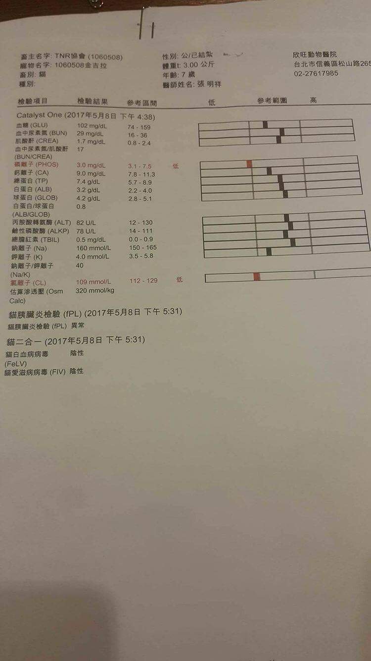 救援到他帶進了醫院,四肢指甲全都倒勾插進肉了,醫生幫他處理指甲時,已不知是驚慌還是痛感讓他不斷的拉肚子跟慘哭,出來的排泄物都是黑黑綠綠,毛沾到慘不忍睹,後來稍微的安撫做了全套血液含電解質檢查,跟二合一,二合一過關了,但發現他胰臟炎呈現陽性反應,紅血球結構不正常(HCT異常),使用DPO(長效性紅血球生成素)治療。