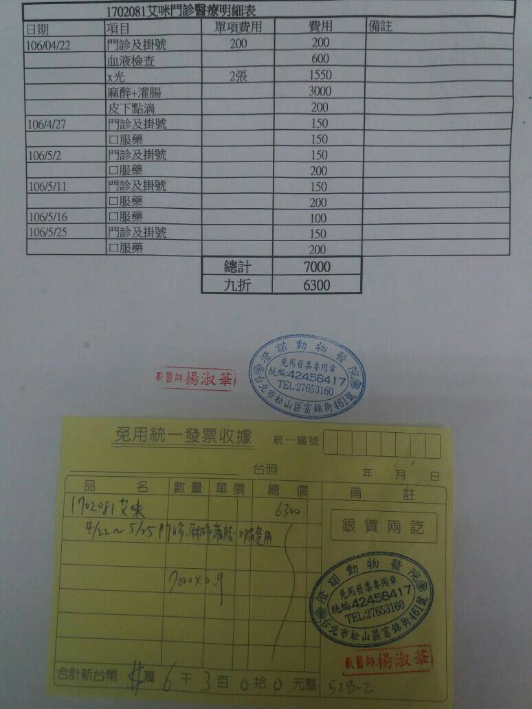 主題: 骨盆腔狹小進行灌腸與追蹤治療的艾咪 申請者姓名: 臺北市支持流浪貓絕育計劃協會 花色: 申請日期: 2017-06-15 11:28:56 申請者部落格: 申請者臉書網址: 所在縣市/合作醫院: 台北市/澄諾動物醫院 治療費用: 6300元 需求人數: 15人 已結案 (2024-06-01 13:27:02) 報名人員: 海郁(已付款)、ocean(已付款)、琪芳(已付款)、林妮妮(已付款)、COCO(已付款)、Jin(已付款)、Karen Chiou x2(已付款)、Tsai Dobbie x2(已付款)、meemee(已付款)、貓步小姐(已付款)、yushi0304 x3(已付款)、 候補人員: 動物病情說明: 因骨盆與腿部骨折而導致骨盆狹小的艾咪,