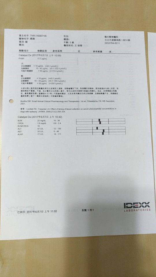 踏踏今日回診驗苯巴比妥濃度,血檢中PHBR濃度為17.7(正常值10-40),也有加驗紅白血球及肝腎指數,通常服用癲癇藥會對肝及腎指數的升高。因為踏踏體重下降,所以癲癇藥的劑量調降一點。