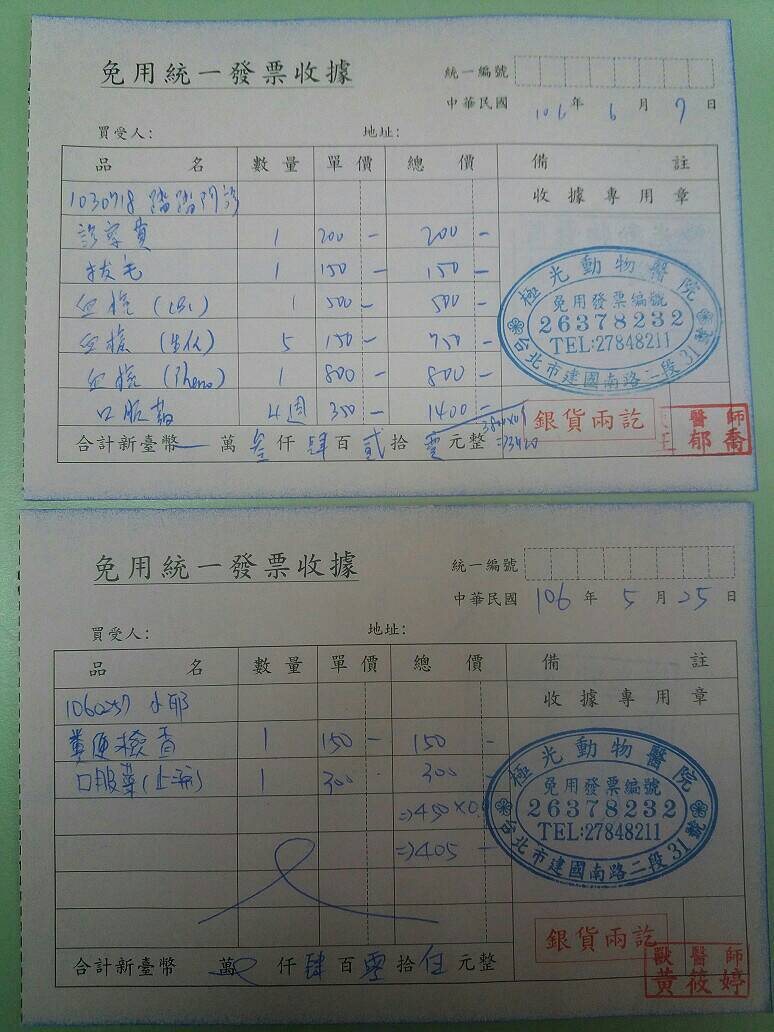 主題: 有癲癇且因黴菌而回診的踏踏以及進行糞檢的乖耶 申請者姓名: 臺北市支持流浪貓絕育計劃協會 花色: 申請日期: 2017-06-15 12:56:49 申請者部落格: 申請者臉書網址: 所在縣市/合作醫院: 台北市/極光動物醫院 治療費用: 3825元 需求人數: 9人 已結案 (2024-06-01 13:26:51) 報名人員: Even Chen(已付款)、Vincent Chiu(已付款)、janet(已付款)、kitty(已付款)、Fandol范朵 x2(已付款)、jerr(已付款)、姜呱呱(已付款)、Belle(已付款)、 候補人員: 動物病情說明: 踏踏是2014年由五股收容所帶出,