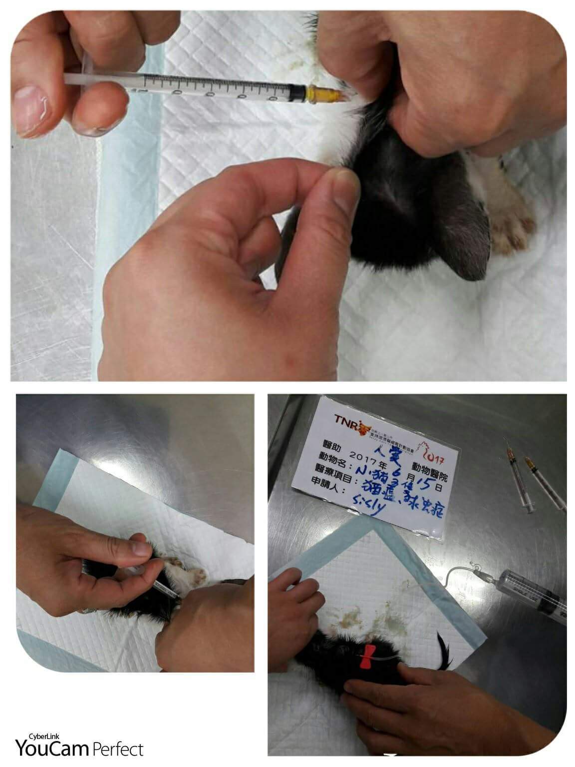 主題: 五隻貓瘟球蟲小貓 申請者姓名: 劉雅雲 花色: 申請日期: 2017-07-07 20:30:21 申請者部落格: 申請者臉書網址: https://m.facebook.com/sisly.liu?ref=bookmarks 所在縣市/合作醫院: 高雄市/人愛動物醫院 治療費用: 7380元 需求人數: 16人 已結案 (2024-06-01 13:26:29) 報名人員: 楊琳琰(已付款)、Esmeralda(已付款)、Mia Chao(已付款)、mason(已付款)、薇薇安(已付款)、Gi x2(已付款)、Guan-Yi Li(已付款)、Fatefaye Wu(已付款)、劉瑄 x2(已付款)、季嫻(已付款)、tigercat x4(已付款)、 候補人員: 動物病情說明: 下雨天發現這一窩小貓,一隻躺著不太動了,5隻都送到醫院去,一到醫院檢查就當場一隻拉出血便,驗了是貓瘟還有球蟲感染,醫生說狀況不太好,趕緊打皮下輸液,住院治療,希望小貓有活命機會。