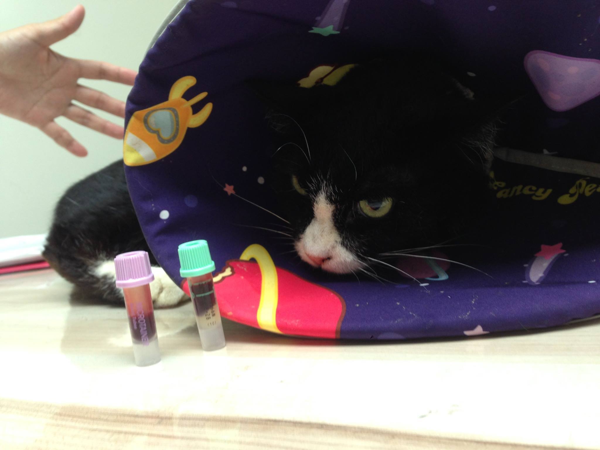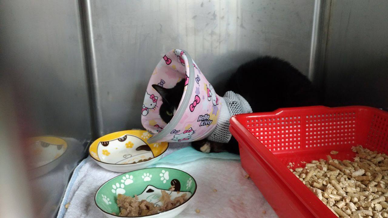 麵滷這次住院,是因為要照胃視鏡,照胃視鏡的結果,什麼異狀都沒有,算是好事。也因為麻醉照胃視鏡,醫生順便把麵滷的食道餵管裝上去。頭套請持續戴著,可防止去踢管子或者舔毛。