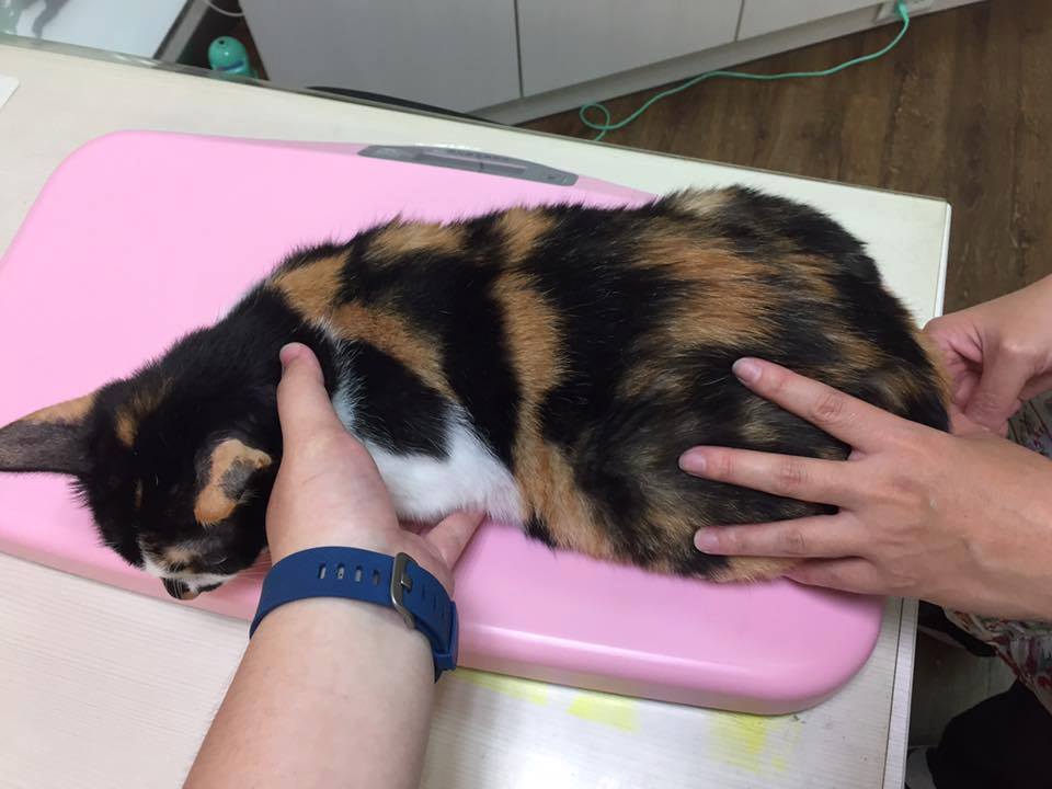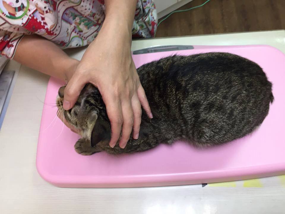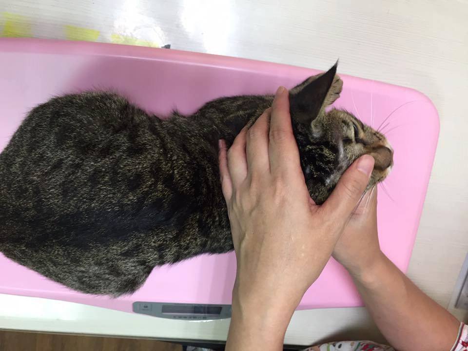 是民眾通報被鐵門壓到頭的小貓,緊急送醫治療後救回一命,