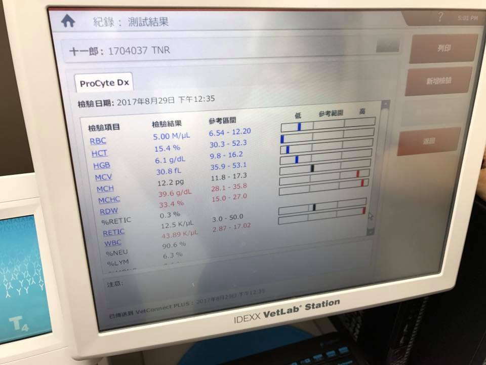 檢查發現,十一郎插管處潰爛,抽取尿液檢查有傷口的濃水,判斷是粉粉的尿應該是傷口引起的,目前先把餵食管,拿掉,清創,讓傷口癒合,暫時住院照顧。