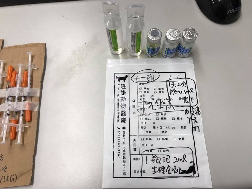 2.皮下點滴LR早晚各100ml,打完三管水後,把針筒拿掉,換成抗生素針筒打入0.3ml,在換回原本針筒打第四管