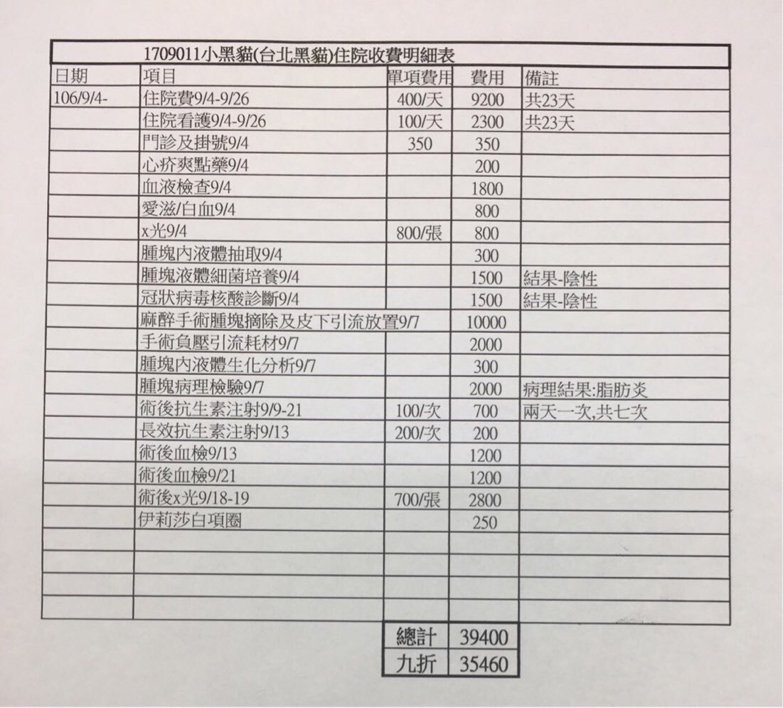 主題: 收受到撞擊導致皮下脂肪發炎,肚子大如水球的黑珍珠 申請者姓名: 吳怡萱 花色: 申請日期: 2017-10-03 16:52:15 申請者部落格: 申請者臉書網址: 所在縣市/合作醫院: 台北市/澄諾動物醫院 治療費用: 35460元 需求人數: 37人 已結案 (2024-06-01 13:22:23) 報名人員: Aisha Lung(已付款)、洪凱威(已付款)、Patrick x3(已付款)、mmgirls77(已付款)、silviacat(已付款)、菲力克斯(已付款)、Katze Chen(已付款)、Joe Hook(已付款)、Joyce Chen x2(已付款)、kuroneko(已付款)、Helen Yu(已付款)、邱凱偉(已付款)、邱凱偉、郭庭甄 x2(已付款)、Evan(已付款)、opel0209(已付款)、李坤財(已付款)、薇薇安(已付款)、Ting Huang x2(已付款)、山姆大叔(已付款)、ali(已付款)、Abby Lin(已付款)、Angelwang維(已付款)、Rebecca(已付款)、hideaki x3(已付款)、Flower Zhang(已付款)、House Hsu(已付款)、Yumiko Lee(已付款)、Betty Kao(已付款)、Autumn Tree(已付款)、Coffeemilk(已付款)、 候補人員: 動物病情說明: 平日餵養的浪貓媽媽黑珍珠