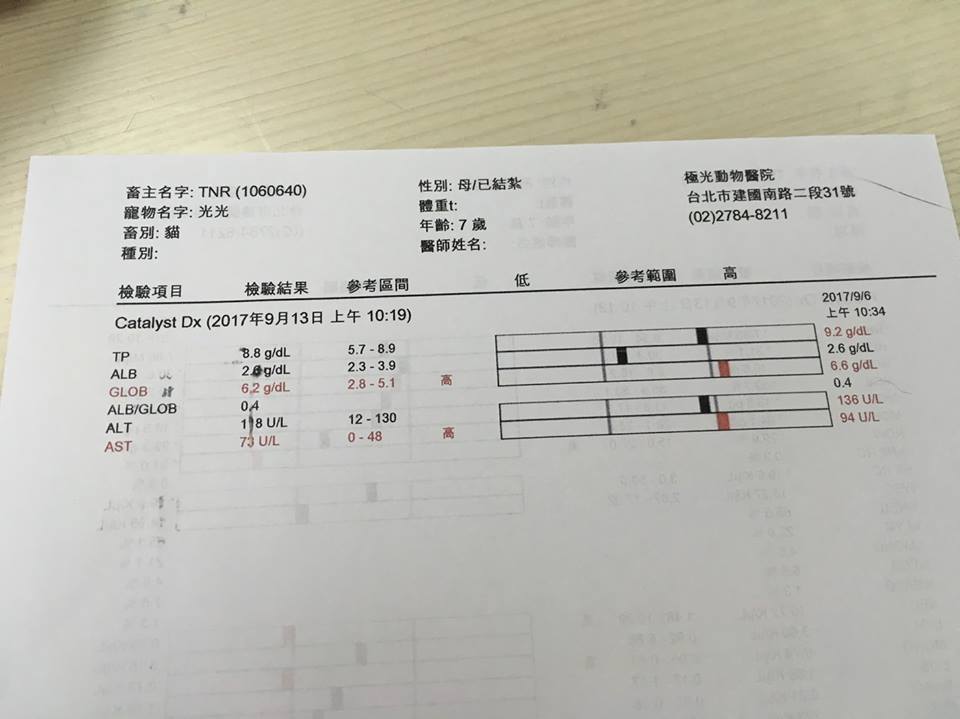 主題: 口腔紅腫,呼吸道感染,有貧血且肝指數高的盈盈 申請者姓名: 臺北市支持流浪貓絕育計劃協會 花色: 申請日期: 2017-09-15 11:24:48 申請者部落格: 申請者臉書網址: 所在縣市/合作醫院: 台北市/極光動物醫院 治療費用: 4437元 需求人數: 11人 已結案 (2024-06-01 13:22:04) 報名人員: Lai Ying(已付款)、Ellen Cheng(已付款)、Maru Ho(已付款)、Eight(已付款)、Peiti(已付款)、Candice Chao x2(已付款)、a-song x2(已付款)、a-song x2、Ed Tsai x2(已付款)、 候補人員: 動物病情說明: 已全口拔牙的盈盈有上呼吸道症狀