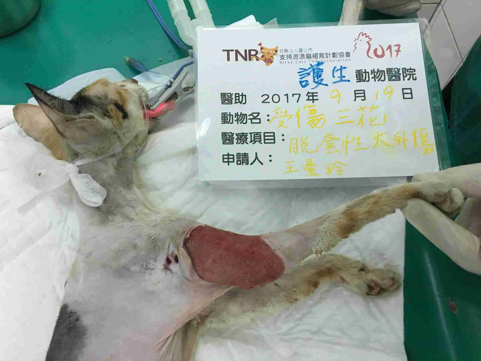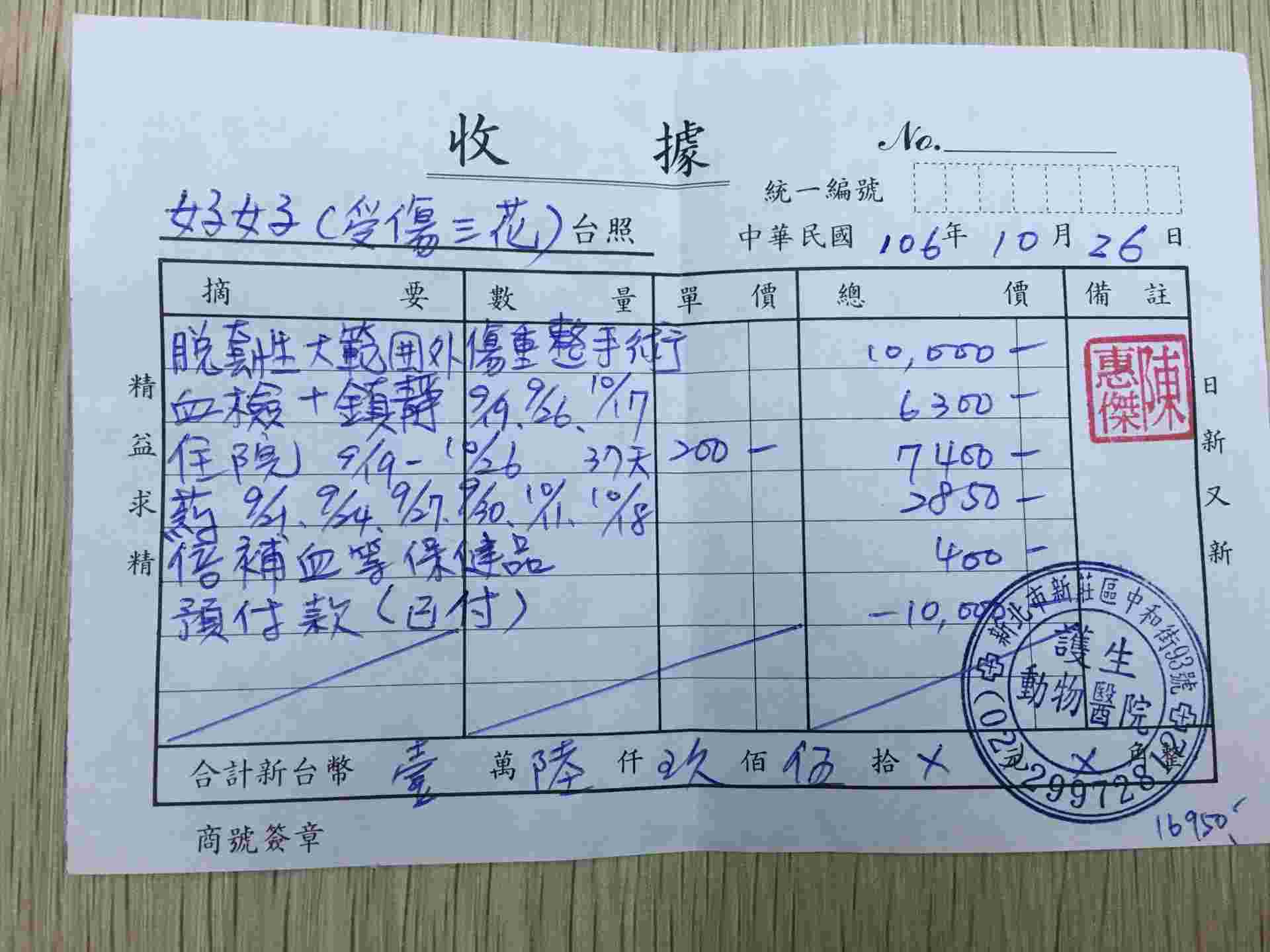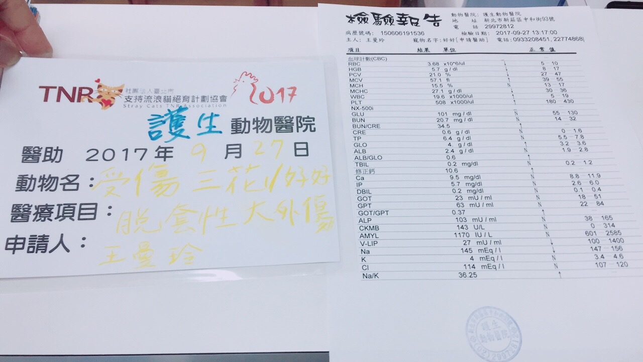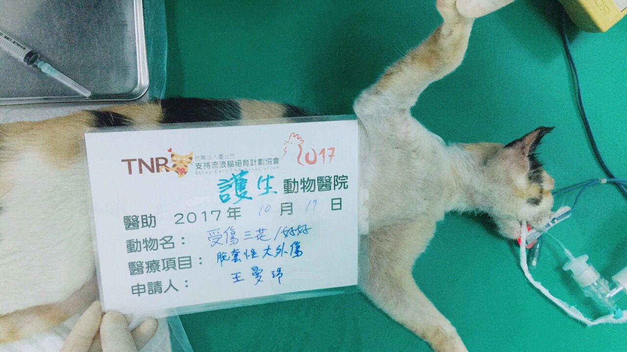 主題: 新莊受傷三花母貓 申請者姓名: 王曼玲 花色: 申請日期: 2017-11-01 17:44:49 申請者部落格: 申請者臉書網址: https://www.facebook.com/profile.php?id=100000050539764 所在縣市/合作醫院: 新北市/護生動物醫院 治療費用: 16950元 需求人數: 37人 已結案 (2024-06-01 13:21:44) 報名人員: LYNN CHEN(已付款)、陳昱先 x4(已付款)、Jenny Shen x10(已付款)、misselaine x2(已付款)、mucarin(已付款)、邱素玲(已付款)、Tseng Hsiu Ju(已付款)、z(已付款)、薇薇安(已付款)、蔡淑伊(已付款)、黃小空(已付款)、Agnes Wang(已付款)、潘逸群(已付款)、Yumi Ho x2(已付款)、Wei Li(已付款)、sosuenia、sosuenia(已付款)、淑惠 x2(已付款)、Ting Lu(已付款)、Xiao Ting Xu、Ed Tsai x2(已付款)、洪凱威 x2(已付款)、 候補人員: 動物病情說明: 在9/19誘捕到受傷母貓好好,於晚間送至新莊護生動物醫院之後,我又趕著回社區在誘捕剩下的3-4隻幼貓,幼貓們預計在隔離觀察後,分別安置在我家及付費中途準備送養。母貓則留置醫院治療照護。經醫生麻醉好好之後,發現好好的右前肢關節處整片整圈的皮膚都不見了,手術後也發現好好有貧血的狀況,因此也給予了倍補血讓好好可以改善貧血的狀況以順利恢復健康,並在住院期間持續給我好好口服抗生素,避免感染。小貓們光是住院隔離驅蟲除蚤就已經花費15000元以上,還不包含飼料、罐頭及益生菌等,好好的醫療費用總計26950元,我已經預付醫院10000元,剩餘的費用懇請各位善心人士伸出援手,幫忙捐助剩餘的費用,謝謝大家。 動物近況說明: 經過一個多月的住院治療,觀察好好對人一直是哈氣不斷甚至會伸手作勢要打,因此經過考慮後,還是在10/26晚間將好好原地放回,後續由我負責餵養觀察。
