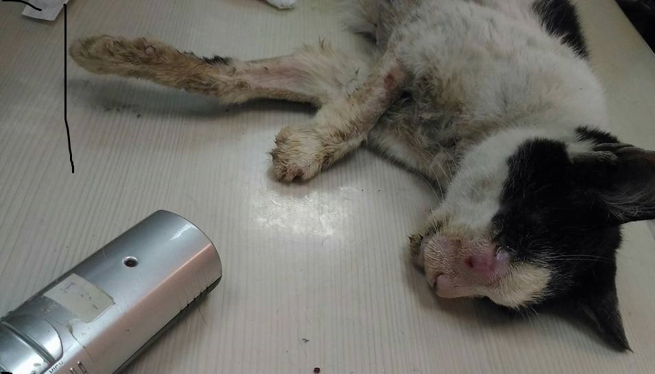 我撈起晶晶,原本是以為只是眼睛問題治療,後來才知道她牙都沒了,剩三顆犬齒,其中上犬齒兩顆也在搖動,醫生說浪貓來說至少七八歲,算老貓了。她全身跳蚤,眼睛一隻受傷感染已霧化,另一隻因為腫脹壓迫到,張不太開,昨天醫生還發現,右前腳也有舊傷,只剩一趾半,還有一顆乳腺發炎,腫瘤三公分大,有抽出血水消腫些。