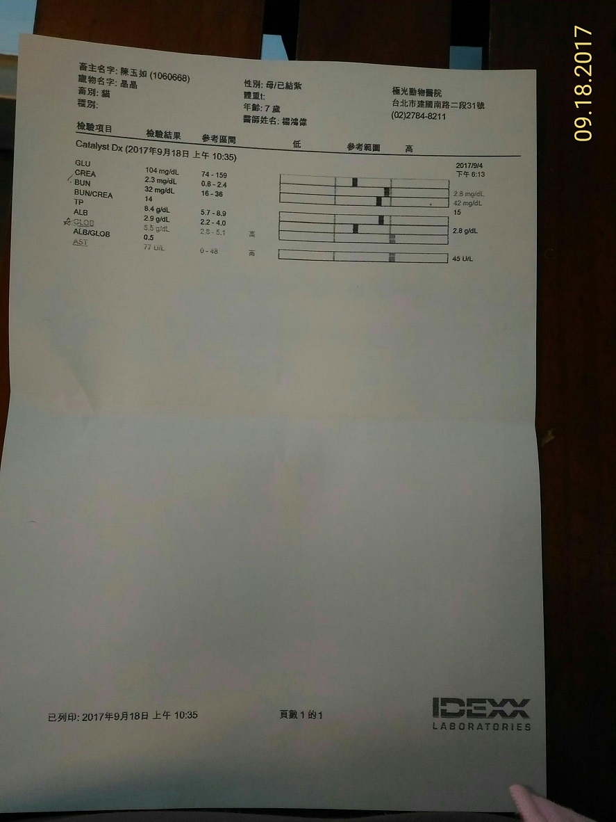 3血檢報告顯示: 此次只做幾項生化檢查, 上次腎指數(兩週前)BUN/CREA超標, 這次 數值都在標準值內, 很欣慰, GLOB/AST 上次正常, 這次超標