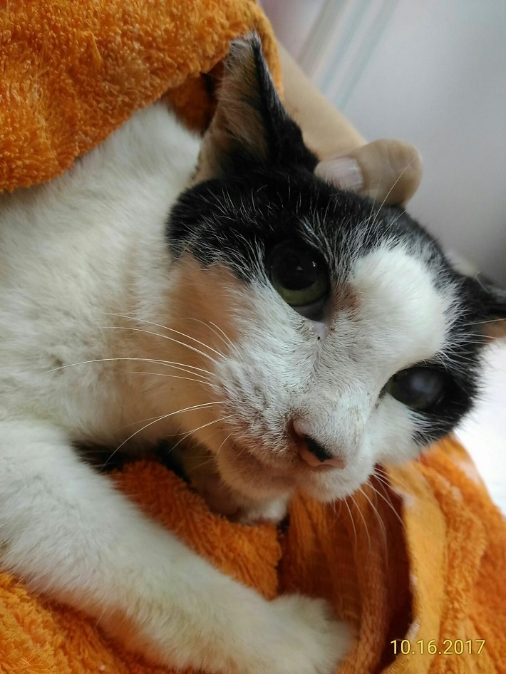 她的左眼看不見,右眼發炎,腫脹,我撈起她住院一週了,醫生說她很老了,牙齒都掉光,只剩三顆犬齒,因為是浪貓,年歲已高, 研判可能有七八歲以上,已結紮剪耳,但掃不到晶片,所以, 我不知道她以前是否有愛媽照顧?