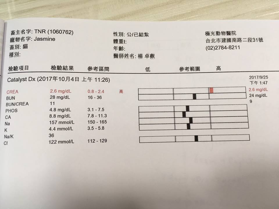 Jasmine血檢腎指數過高2.6,雖然與前次回診數值相同,但醫師認為可能未來會有慢性腎衰的狀況,