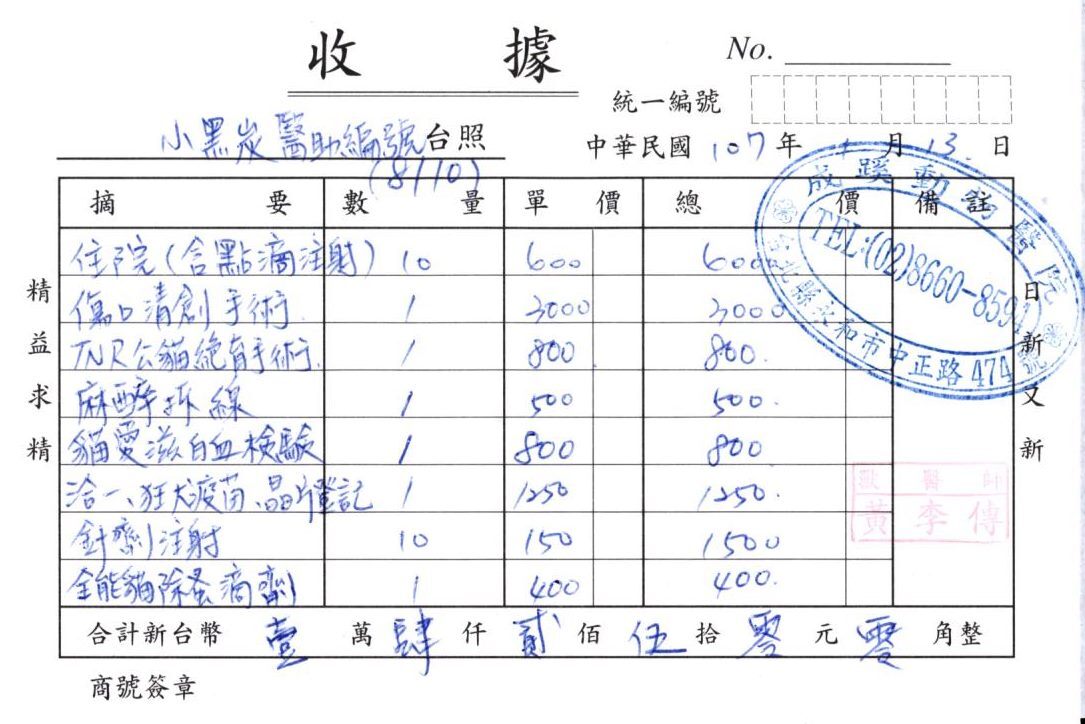 因為沒辦法帶小黑碳回家照顧,所以一直讓他住在醫院,除了前面打點滴的10天,其餘住院費用自付(沒有列在收據上) ,感謝協會伸出援手,也懇請大家幫忙這乖孩子的醫藥費,感謝大家。