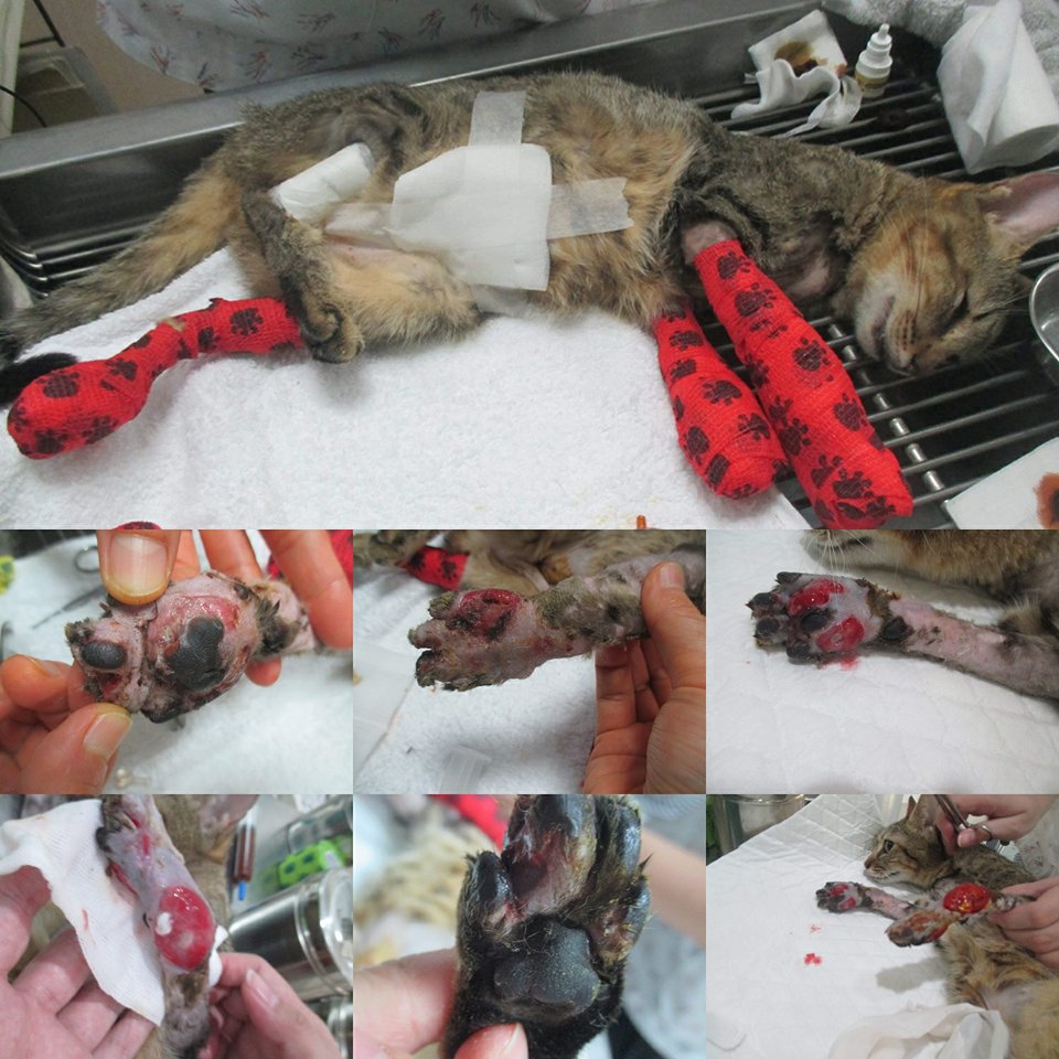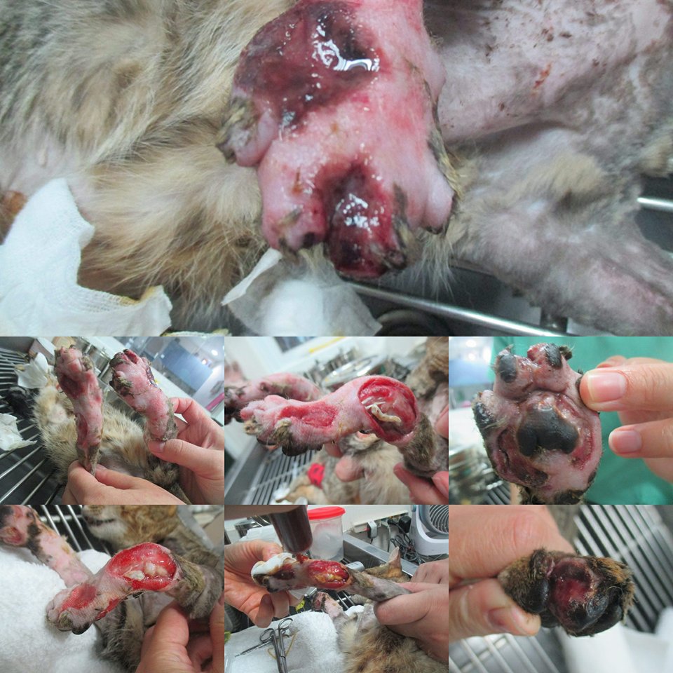 因為肚子有開過刀的傷口~所以推測會不會是有人結扎的貓~~但腳上的傷口實在沒辦法去知道怎麼傷到的~還這麼嚴重~~所以沒辦法去了解是結扎的貓被原放後~後來腳又受傷~~還是再原本的醫院就這樣~人家不願治療被丟在路邊等死~~剛好被我發現~~
