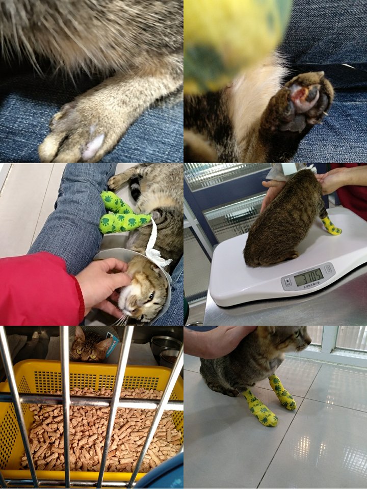 帶來的貓咪兩前腳及右後肢皆有外傷,尤其兩前肢受傷嚴重,感染深且皮膚潰爛,目前並無法進行手術縫合,待貓咪的狀況穩定後再評估是否手術縫合,已先初步鎮定清創及點滴輸液給藥治療,初步血液檢驗,無貓愛滋病及白血病,血檢方面電解質均偏低,呈現低滲透性脫水,有可能有內分泌的問題,已先點滴補充,日後再追蹤檢查,此外白血球數正常但有白血球核左轉現象,也就是感染嚴重造成白血球開始出現不足,也就是感染如沒有控制下來,有可能會出現敗血症動物近況說明: 今天休假~~過去看受傷貓咪的狀況~因為有感冒~~剛好碰到再做噴物治療~~醫生說貓咪的傷口狀況有好點~~目前食慾~除了乾乾不吃外~罐頭很喜歡吃~但食慾還是時好時不是很好~~但至少比剛送進來醫院感覺精神也有好多了~