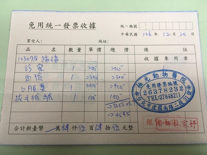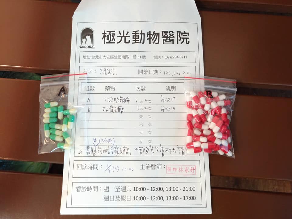 醫師覺得,踏踏的嘴週遭脫毛變嚴重,耳朵也有一些禿毛,拔毛檢驗,沒有異常,猜測可能是近期換食物過敏。醫師先開抗組織胺,如果範圍沒有擴大或持平皆不用回診。