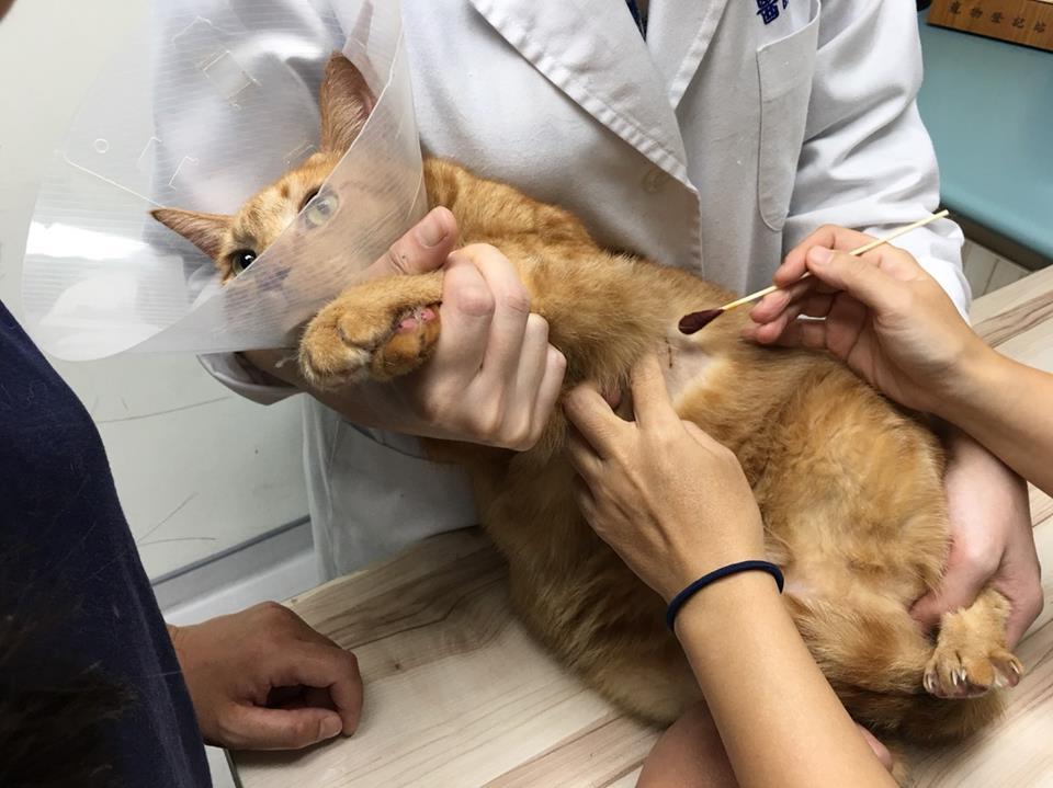 醫師替艾考腋下(側腹邊)傷口進行清創以及皮釘