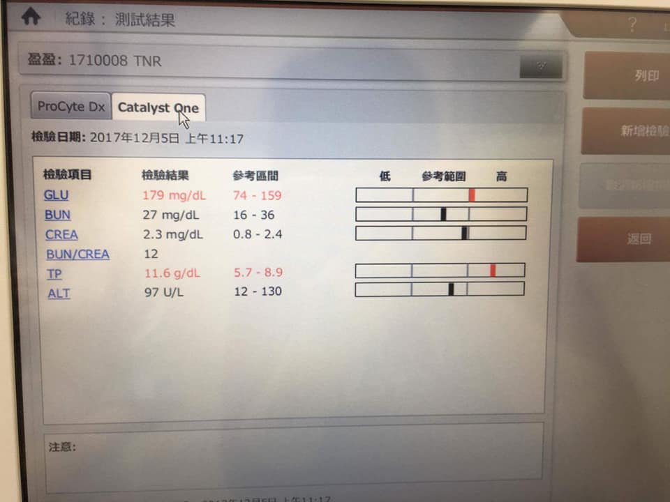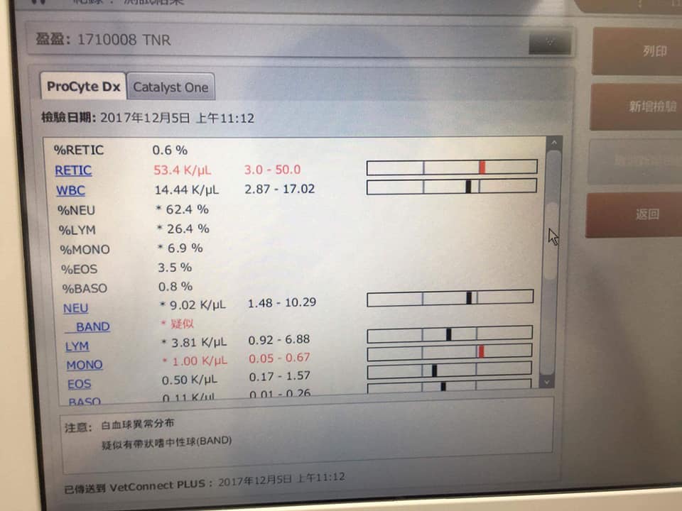 而血液檢查有肝指數上升與貧血之症狀,並合併呼吸道感染狀況,身體十分耗弱。