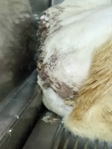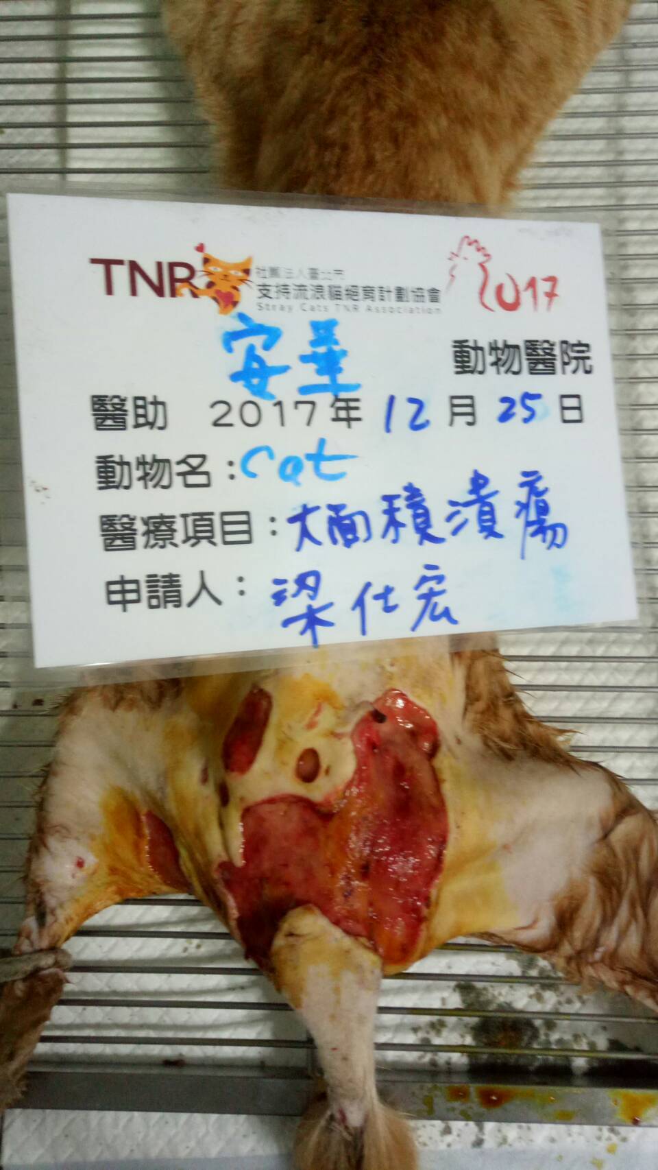 主題: 被狗咬傷後被大面積潰爛的星星 申請者姓名: 梁仕宏 花色: 申請日期: 2018-01-25 14:47:55 申請者部落格: 申請者臉書網址: 梁仕宏 所在縣市/合作醫院: 高雄市/安華動物醫院 治療費用: 22100元 需求人數: 47人 已結案 (2024-06-01 13:18:13) 報名人員: 繪里(已付款)、Sophia Kuo x3、Sophia Kuo x3、Sophia Kuo x3(已付款)、王洪明(已付款)、康妮(已付款)、薇薇安(已付款)、大喵咪 x2(已付款)、陳湘澐(已付款)、Ooxx Chou(已付款)、Wan-Cheng Chou(已付款)、Alada Meow、Alada Meow(已付款)、eunie1122 x2(已付款)、Alisa Huang(已付款)、Debby Chen x2(已付款)、Vivian Chan(已付款)、家有三色喵(已付款)、xena chou x2(已付款)、梁仕宏 x2(已付款)、Tong Tong Wu x2(已付款)、monkey5h(已付款)、Elsa Tu(已付款)、Yan-Ling Lai x2(已付款)、maggie(已付款)、Ria x2(已付款)、Makiyo(已付款)、林珮涵(已付款)、Jackie x4(已付款)、JUN x2(已付款)、Chia-Hung Ma x2(已付款)、林珮涵(已付款)、Hsuan(已付款)、張芸慈(已付款)、彷彿是昨天(已付款)、 候補人員: 動物病情說明: 星星是住在正興路巷內吳大姊餵養的浪貓,上週曾消失幾天不見,但在星期四再見到她出現時,卻發現她的後背到腳出現了大面積的潰爛,由於吳大姐是獨自餵養貓咪者,也不知如何尋求協助。還好她的朋友陳大姊曾來跟我認養貓咪過,所以來尋求我的幫忙,於是我星期五晚上帶著誘捕籠去她家幫忙佈設。不過星星晚上只將籠外的誘餌吃掉,沒有進籠,不過星期六晚上再度出現,可能是肚子太餓,所以被誘捕成功了,我立刻送到醫院處理,經初步觀察外觀,可能是遭到浪狗咬傷,加上她自己去舔傷口,所以有大面積的潰爛,所幸看來沒有感染嚴重的情形,但因為她需要做大面積的清創手術,所以當下決定先幫她補充營養,星期一再來進行手術處置。