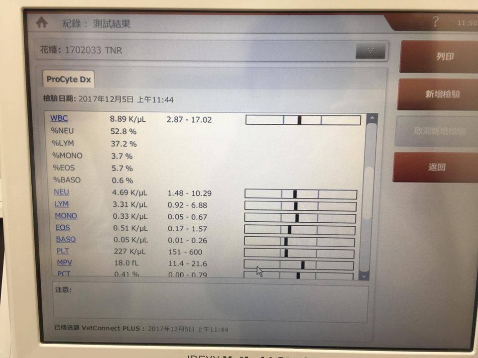 昨日回報血便,今日糞檢裡面無寄生蟲,只有過多的細菌。血便的狀況就在觀察,如果當日血便可以包起來送醫院是最好。