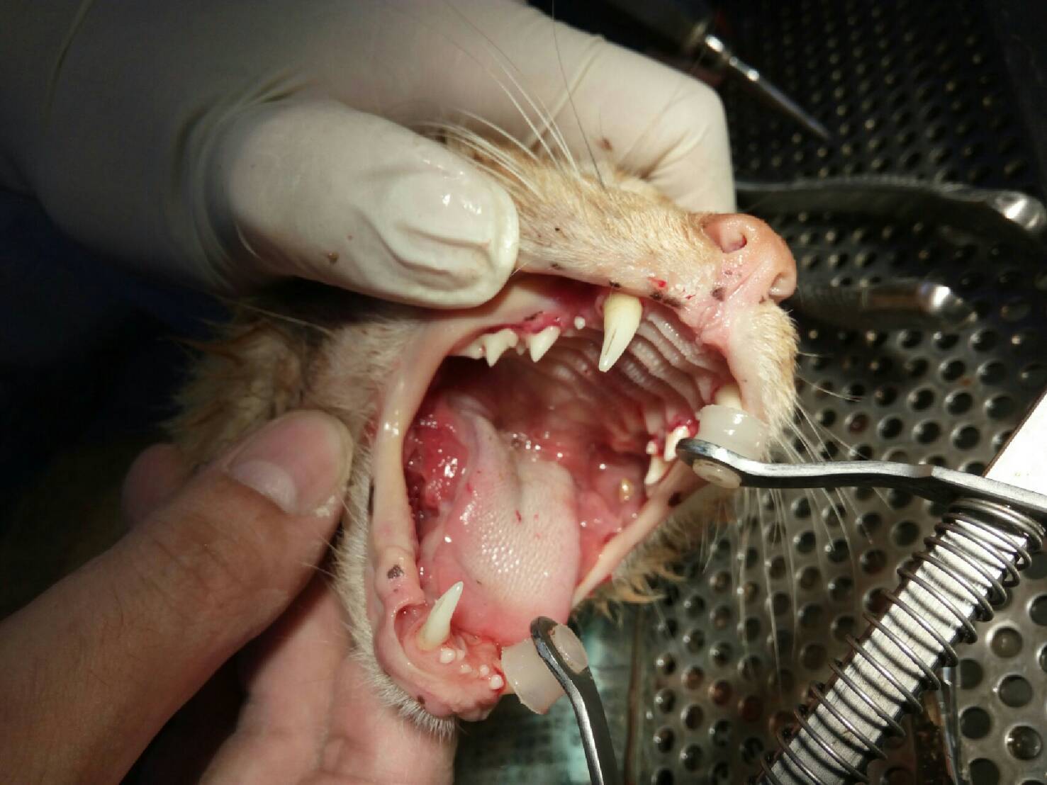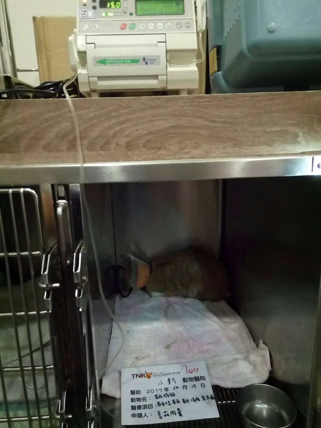 由於Tiger回來沒什麼活動力。所以只好用落罩抓。加上不太吃。也只好用雞肉絲引誘他。還好。孩子還有一點吃的慾望。順利的抓到了他動物近況說明: 原先因病發而對食物也沒興趣的Tiger。在醫師與護士的照顧下。指數慢慢好轉。食慾也越來越好。