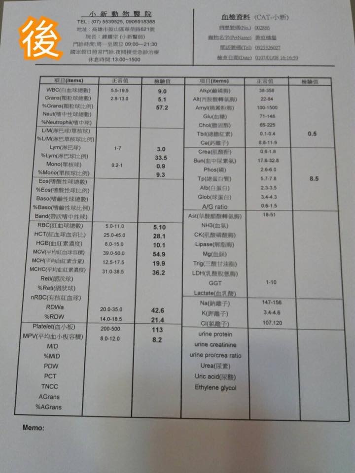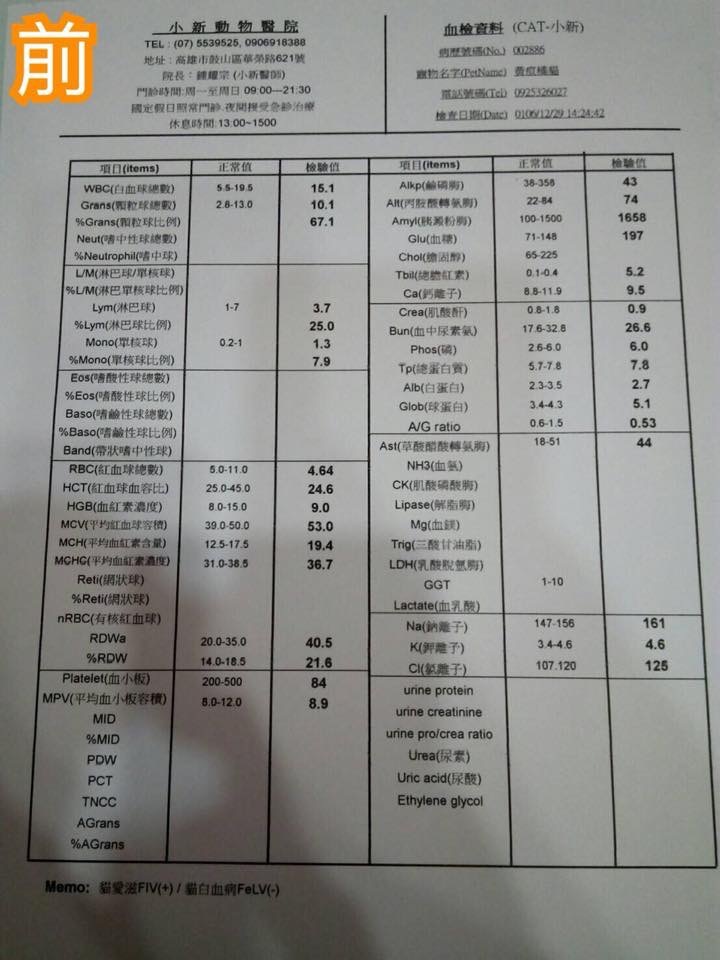 主題: 因愛滋病發而導致黃疸。嚴重貧血。口炎。脫水 申請者姓名: 香菇肉羹 花色: 申請日期: 2018-01-16 20:28:15 申請者部落格: 申請者臉書網址: https://www.facebook.com/cancan1108 所在縣市/合作醫院: 高雄市/小新動物醫院 治療費用: 11000元 需求人數: 25人 已結案 (2024-06-01 13:18:01) 報名人員: Paula Li x2(已付款)、Chin Yu Chao x2(已付款)、陳昱先 x2(已付款)、SKY x2(已付款)、Claire Cai x2(已付款)、金羊毛 x2(已付款)、Chia-Hung Ma x2、李坤財(已付款)、Cynthia Chen x2(已付款)、薇薇安(已付款)、sunny chuang(已付款)、Sinyi x6(已付款)、艾兒 x2(已付款)、 候補人員: 動物病情說明: 有一天沒一天的出現,照顧牠們也有一年許久了。