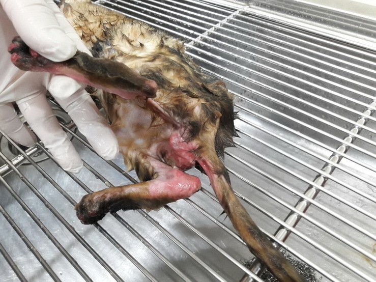 醫師預估約年齡約兩個月大,麻醉後清洗傷口,後肢皮毛皆已磨光,癱瘓導致嚴重褥瘡。
