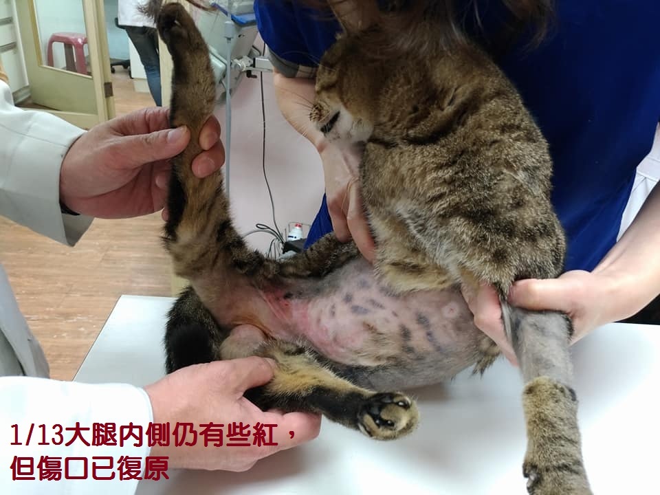 乖妹拆了繃帶,腹部還有些許紅紅的,由於大解放的關係,乖妹會一直舔,需要頭套戴著,直到腹部不紅為止。乖妹左側邊身上有個傷口,那是之前打皮下抗生素,乖妹有點對那個抗生素過敏,所以傷口好的比較慢。
