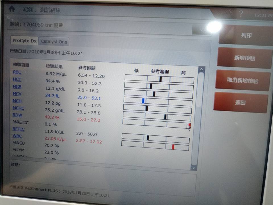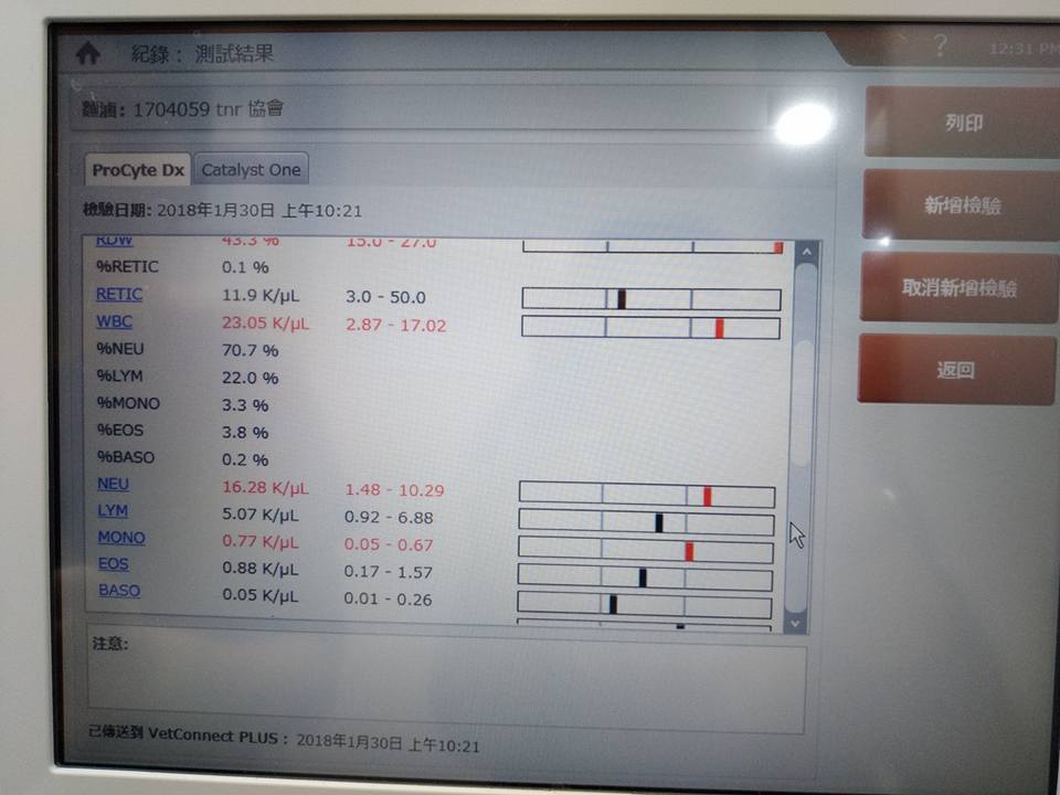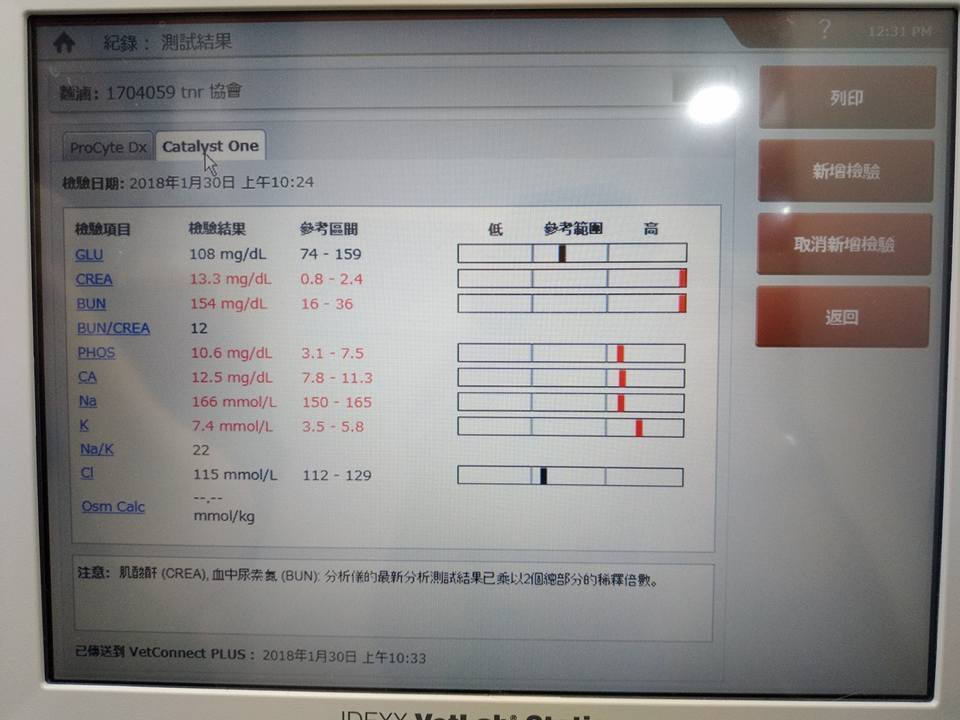 上週有做尿液檢驗結果顯示沒有感染,但口腔仍然發炎嚴重、有膿,如果有不吃請一定要灌食;血檢部分腎指數還是高,白血球略低