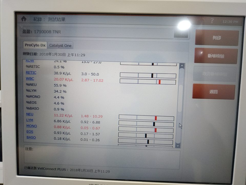 而血液檢查有肝指數上升與貧血之症狀,並合併呼吸道感染狀況,身體十分耗弱。