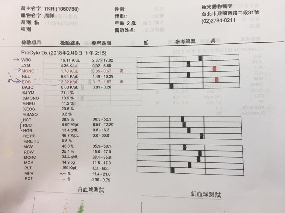 有呼吸道感染,X光片上看到肺部沒有很乾淨;看牙齒牙周與後口應該是有口炎。口腔不舒服也容易造成免疫狀況不穩定,但周詳的口炎不一定會需要類固醇,醫師建議可做洗牙或拔牙,牙齦不會再紅也可以舒服點。所以血檢顯示慢性發炎跟呼吸道、口腔發炎都有連帶關係。X光顯示前肺、支氣管末端明顯偏白,代表有發炎累積;也看到腸道積氣很多(像脹氣),有可能造成食慾不佳,免疫狀況仍然要觀察,EOS數值高但因為同時還有其他發炎正在進行,需要先吃藥排除、驅蟲或糞檢確定沒有寄生蟲感染才能確定,建議還是要「關籠」觀察食慾精神糞便與呼吸道狀況。