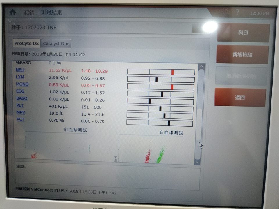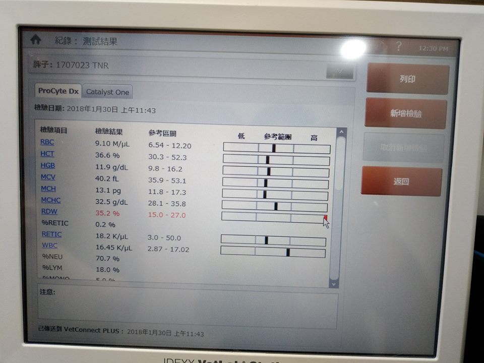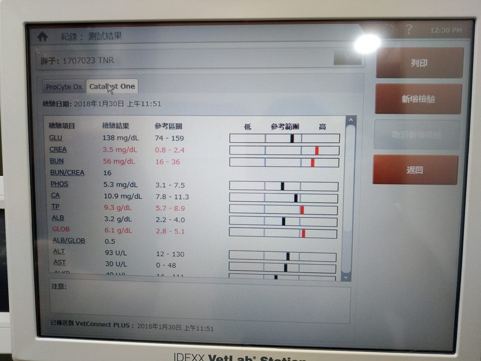 抽血檢查肝指數穩定,可以再吃兩週藥觀察;腎指數雖然偏高但是可以接受,因為胖吉有腎衰關係所以會貧血,醫師這邊會固定一個月回診時施打長效型的造血針跟鐵劑