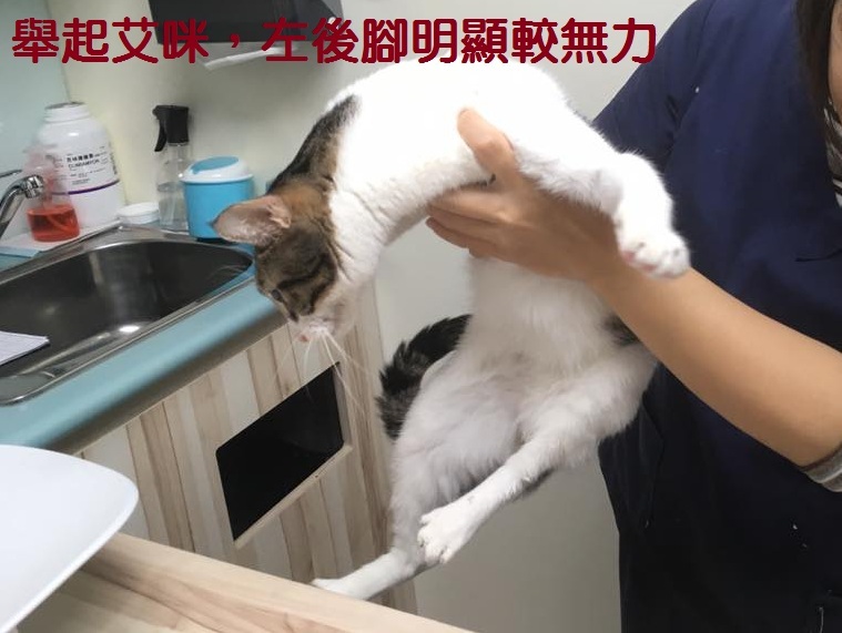 另,醫師發現,艾咪後腿拖行嚴重,左後腿反應神經差,甚至無法腳底翻正,艾咪需嘗試多次才能夠將左腳收回