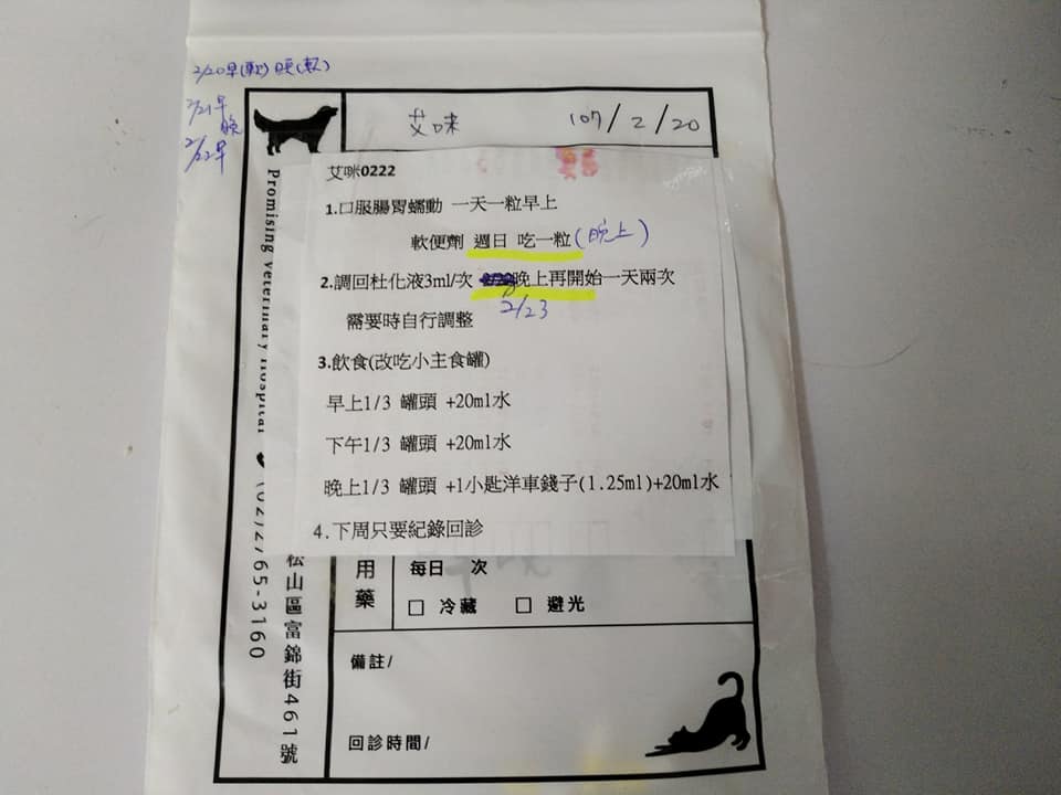 艾咪腸道內的大便非常硬,導致無法排出,今日留院,待明日接回。