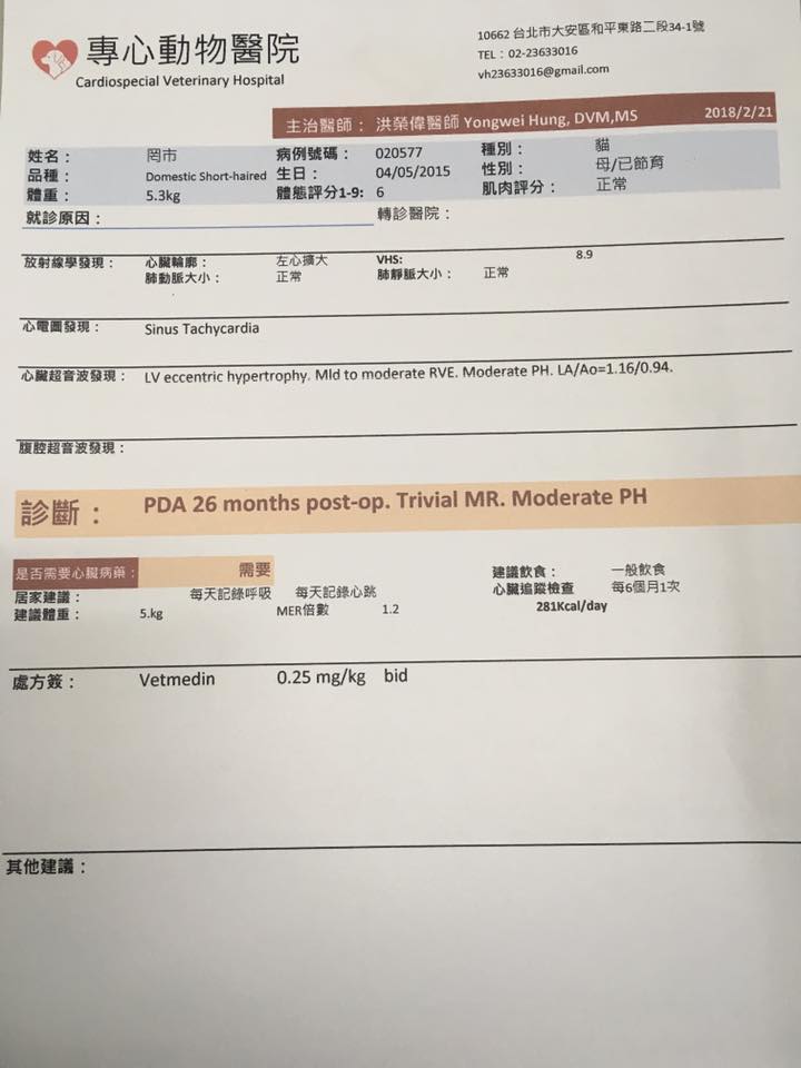 相較於半年前,本次回診罔市的心臟有稍微變小,是好的現象
