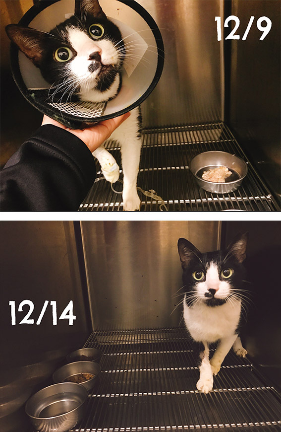 12/14,醫生說目前除了食慾沒有很好外(吃不多),傷口與精神狀況都不錯(一直想趁機會逃脫),如沒有突發狀況可以如期出院,但必須吃幾天藥,回去觀察有正常大小便後才能原放。