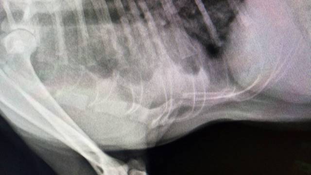 經過了3天,昨天他晚上終於出現但感覺就是沒有精神及元氣,經我初步檢視他的外觀,發現下巴好像腫漲,有出血過,於是趕快送到醫院做更進一步檢查。結果血檢出肝指數異常的飆高,再進一步照X光,才發現原來肋骨斷裂,且心臟部分有出血,有生命危險,推斷可能是出了車禍,現在以氧氣點滴抗生素治療,希望能止住出血讓他能儘快恢復。動物近況說明: 斑斑住院三天內算是危險期,不過他食慾和精神都很好,體力也慢慢地恢復,住院一週後,也無異常狀況發生,所以照預定期間住院二週後出院,出院前為確保他復原正常又再拍了一次X光,確認已沒內出血的問題,也幫他打了預防針後,接回素食攤老闆娘家中靜養,目前一切都很正常。