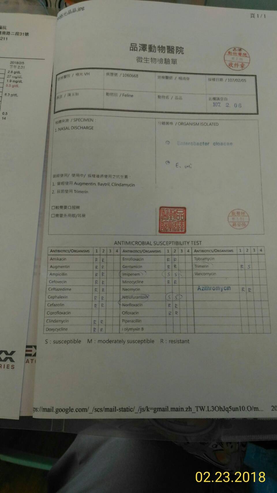 最近兩週, 由於晶晶鼻腔出血狀況沒有改善, 按壓鼻腔血就柳出,呼吸濃濁聲很大, 腫塊可能有增長, 鼻額腫脹趨向嚴重. 2018/2/5回診,進行第二次鼻膿細菌培養。先吃一週目前的藥,一週後培養報告出來.