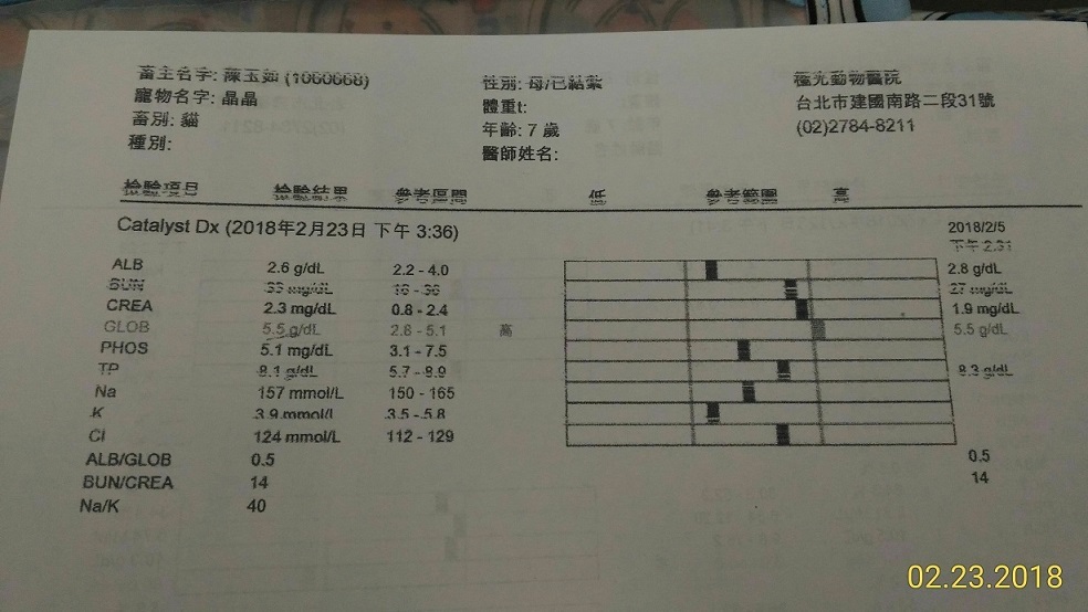 血檢報告發炎指數 GLOB 5.5稍高沒降. 因為上次的抗生素有腎毒性要腎臟排毒,會擔心腎指數。BUN 33/CRE 2.3所以先不打皮下,觀察食慾,如果體重持續下降,要裝食道餵管,以免營養不良, 有加開食慾促進劑, 下週五回診,醫生再決定是否裝管。這一週需觀察食慾狀況。