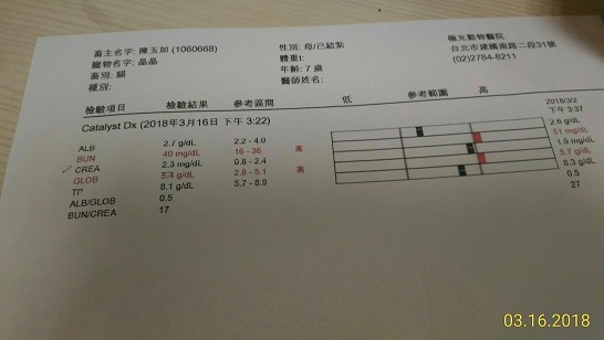 醫生加開酵素錠, 讓我們混進雞肉泥罐中給貓咪食用. 增加熱量攝取. BUN 與 GLOB發炎指數仍超標, 抗生素與消炎藥持續服用.