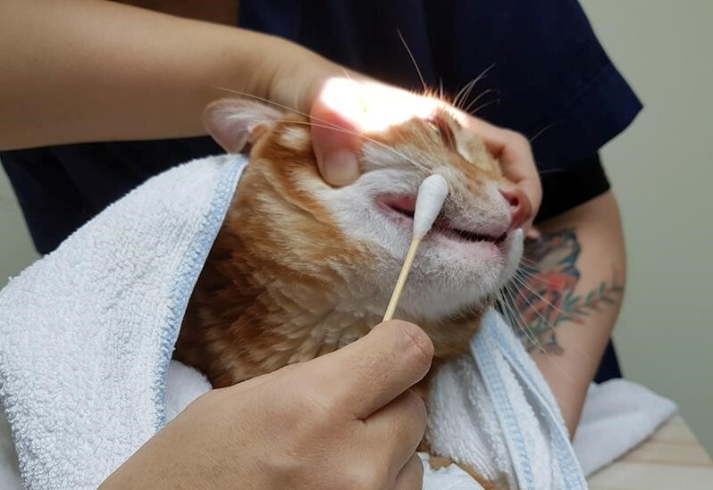 醫生說可能的話,每天可以使用生理食鹽水沖洗一下紋貍的右眼內分泌物,並用乾淨紗布輕輕擦拭.