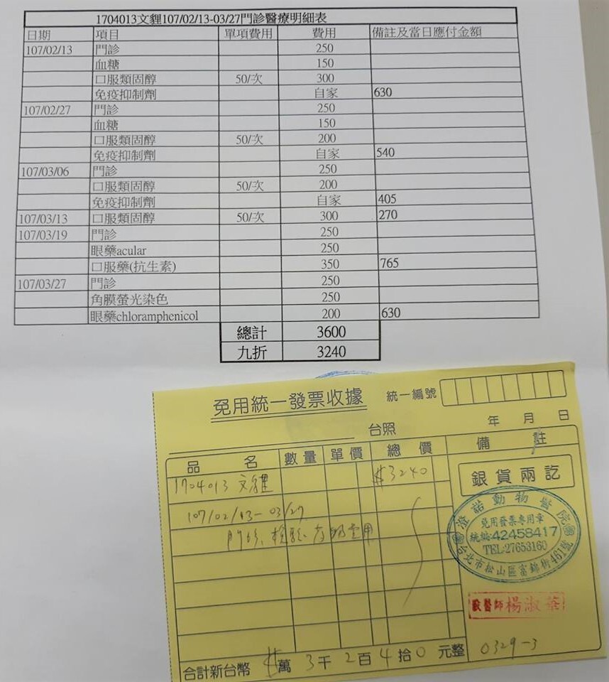 3月時因右眼眼瞼紅腫帶至醫院做角膜染色檢查,醫生開口服藥及眼藥水。