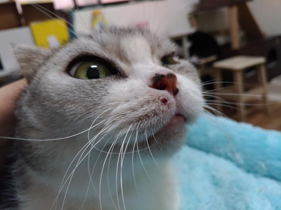 藍寶是從新莊收容所帶出,當時健康狀況很不好,當天血檢白血球高達五萬九,有輕微腹瀉,糞檢有球蟲、絛蟲,除了給予抗生素和噴霧治療,早晚還必需灌食,慢慢小藍寶鼻氣管炎症狀減緩,稍稍恢復食慾,但還是有貧血的症狀,早晚要吃兩次倍補血和噴霧,牠的呼吸系統不好,需要長期吃藥、定期帶牠回診做檢查。