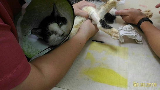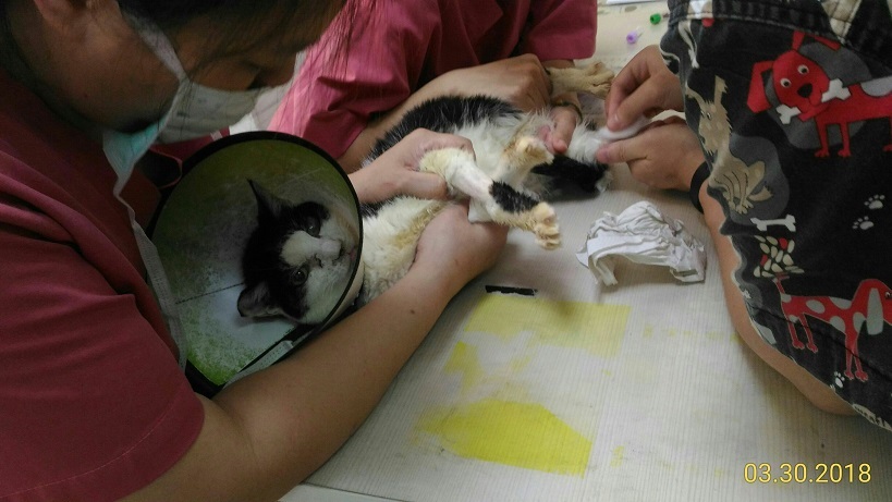 醫生幫貓咪餵管傷口換包紮 , 並進行清理剃毛時, 發現左乳頭有乳腺炎,輕微的瘀腫,剛救援時是右邊的, 需再觀察. 下次回診, 會安排進行更換新的食道胃管.