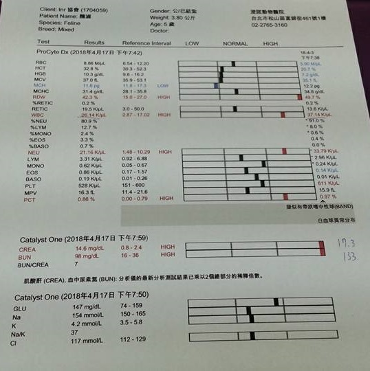 本周腎指數有進步 Crea 22.3 降至17, Bun 200降至133