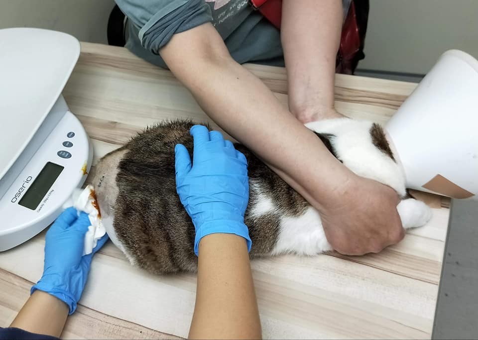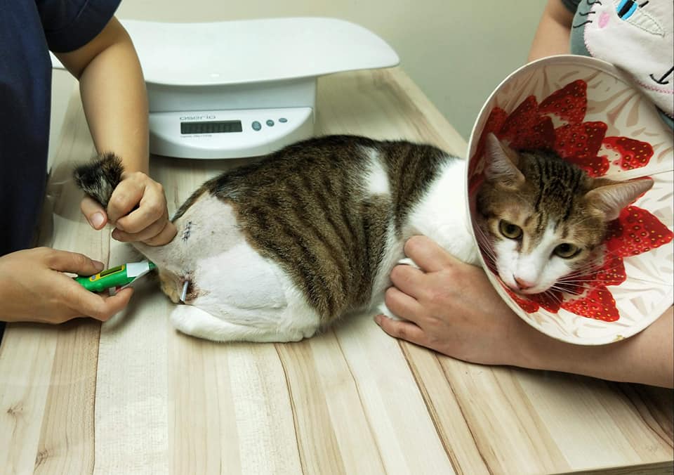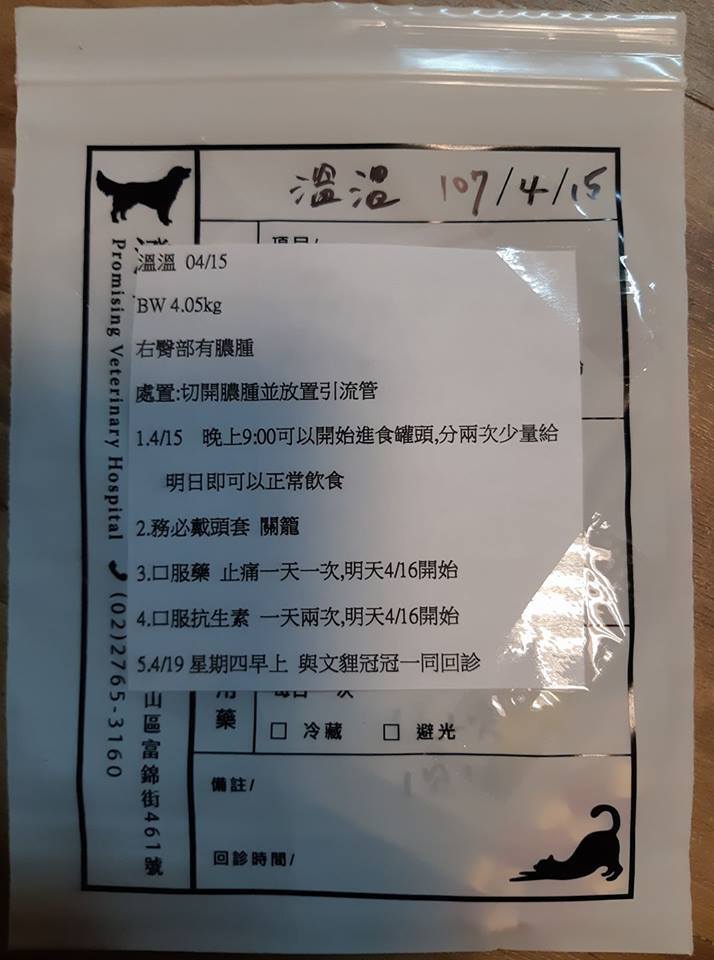 3.請帶著協會的頭套一起過去,因為會帶著引流管一起回來,所以請特別小心。動物近況說明: 傷口已完全恢復,拿掉頭套,跟往常一樣開心的玩耍。