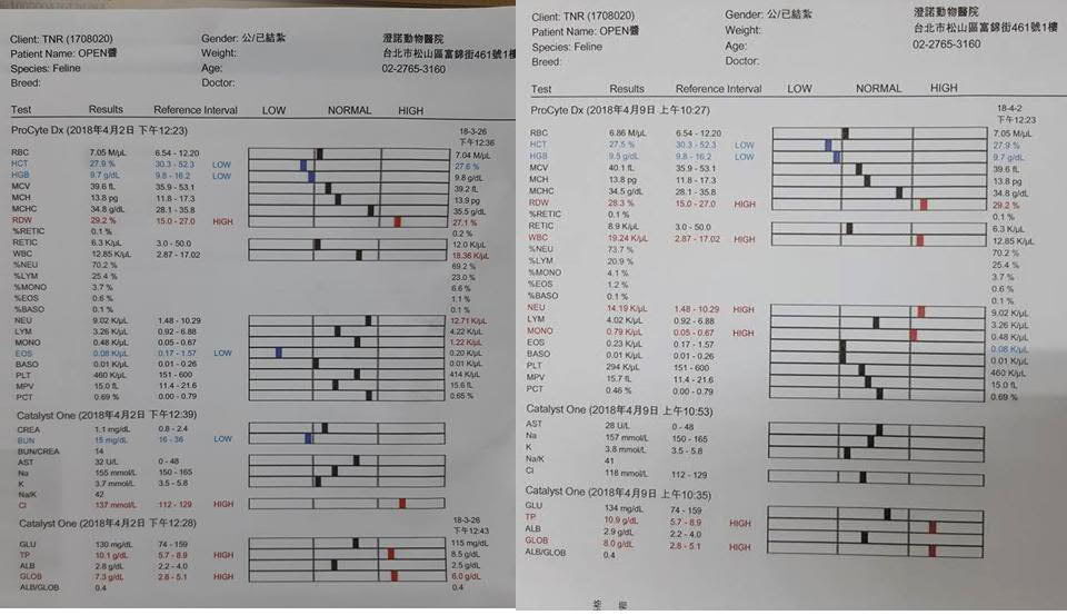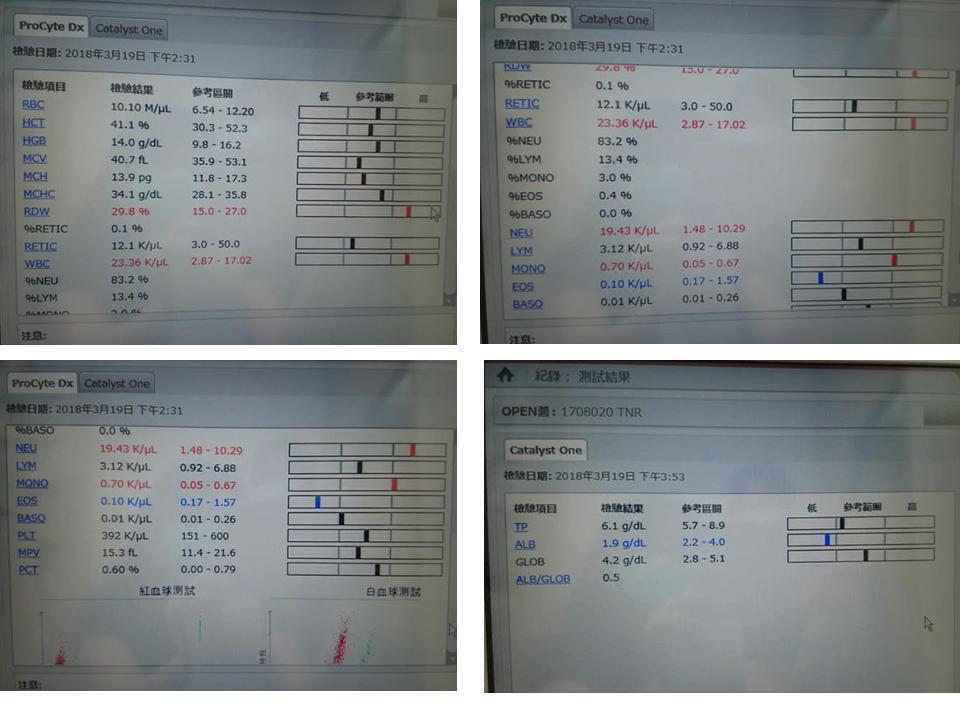 血檢結果,白蛋白和總蛋白比值很低,類似冠狀傳染性腹膜炎,會將檢體送至PCR診斷,可能是某種狀況而引發病毒變異,現進行支持療法,但要等PCR和細菌培養結果後才能確診。