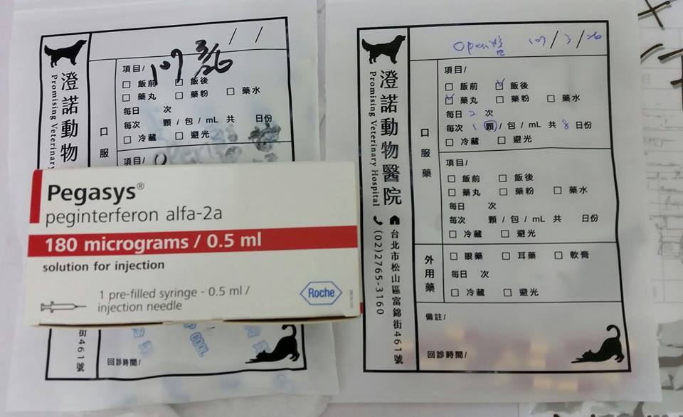 胸水檢驗確診為溼式腹膜炎。動物近況說明: 醫療上配合醫師指示,定期回診、驗血、照超音波、服藥,按日施打干擾素及造血針;照護方面,住三層籠隔離,每日測量呼吸心跳、備有氧氣機隨時讓牠可以舒緩呼吸、選擇適合牠的營養食物煮鮮食希望可以讓牠維持體力。